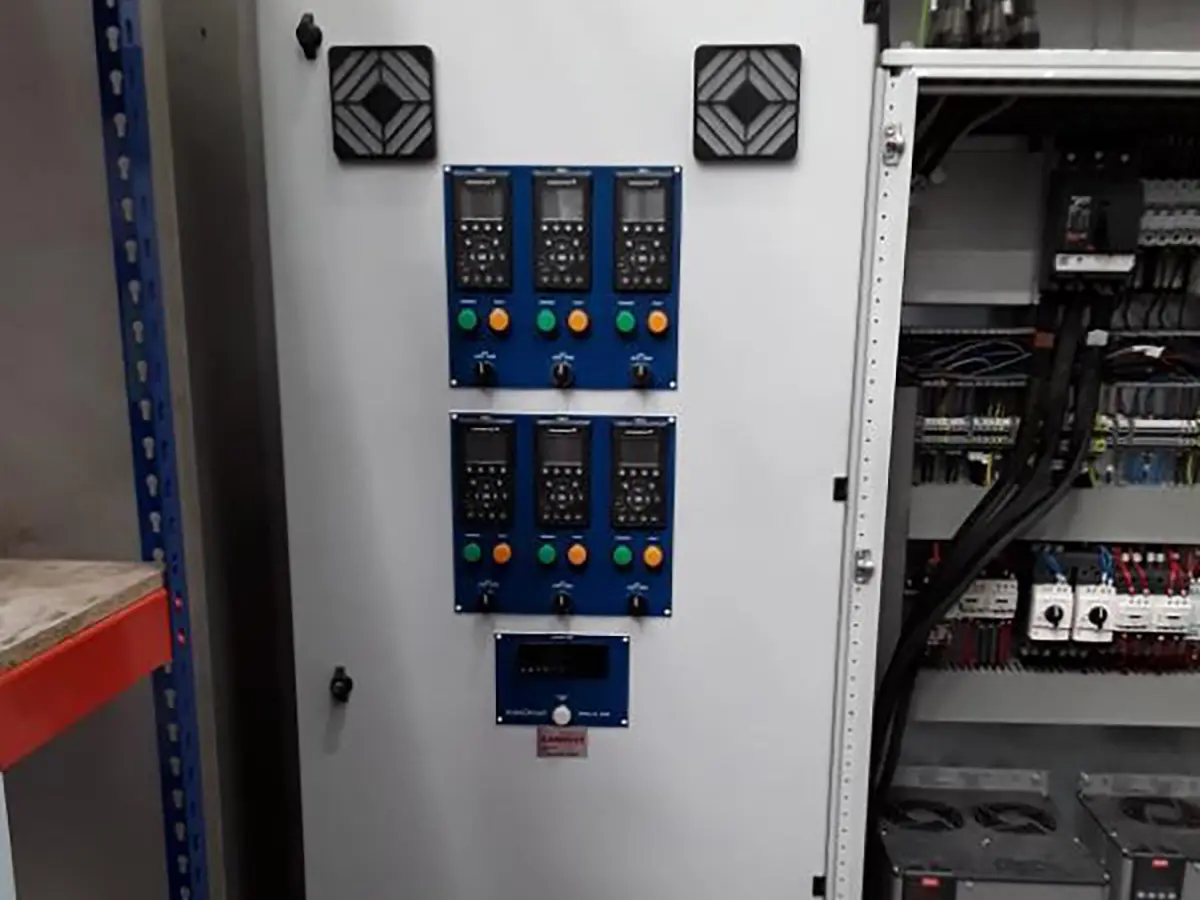 To help the system operate more efficiently, the Dura Pump team built a bespoke control panel with 6 x 18.5 kW Grundfos inverters. This system would also control the fan speed according to the return water temperature.